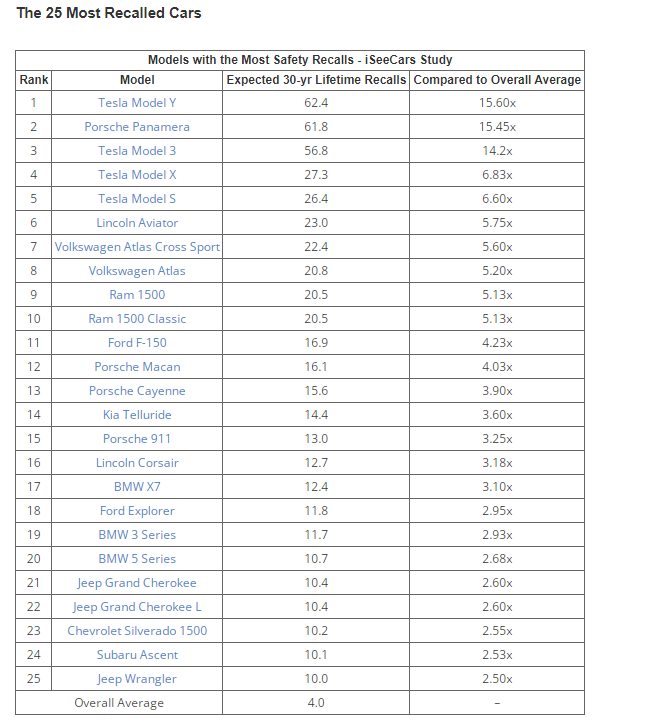 在25款最易被召回的汽车榜单中,特斯拉“成绩优异”地以全系车型占据了榜单前五名中其中四席的位置。保时捷车型也有四款车型出现在榜单上,也基本上覆盖了保时捷产品体系。