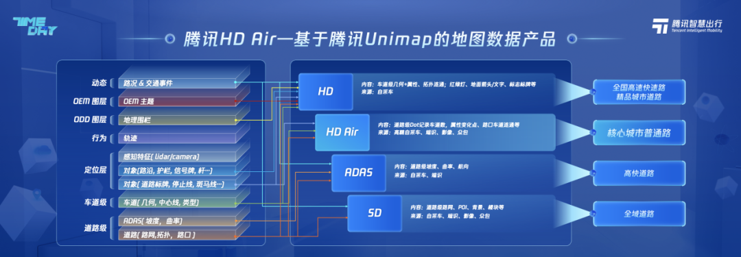 腾讯地图产品总经理陈志介绍,HD Air属于腾讯Unimap数据产品矩阵中一员,介于高精地图数据和ADAS数据之间,预计2023 年底将覆盖50座城市。