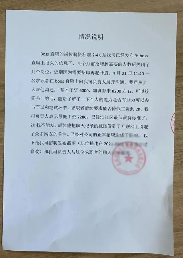 据红星新闻报道,涉事公司法定代表人虞先生告诉记者,网传某招聘软件上公司与求职者的聊天记录属实,但公司此前发布的招聘信息中,该岗位月薪本就是2000元至4000元。如今网传信息部分不属实,已影响到公司正常招聘。
