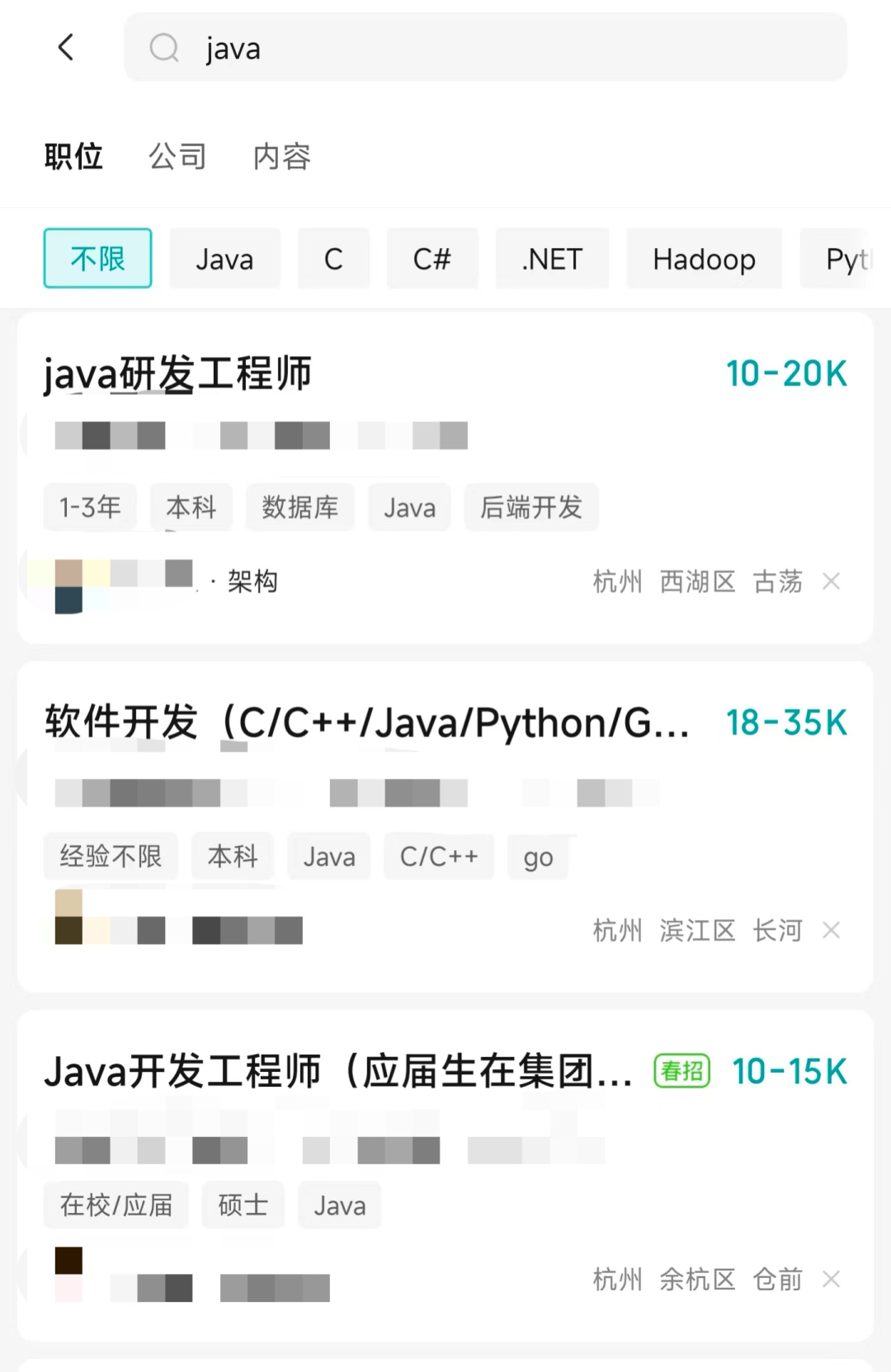 如果你在杭州搜索Java岗位,可以看到研发工程师月薪基本在15K以上,高级架构师、高级专家等对工作经验要求较高的岗位月薪则基本在40K以上,就连Java开发的实习生月薪都在4000-8000元。