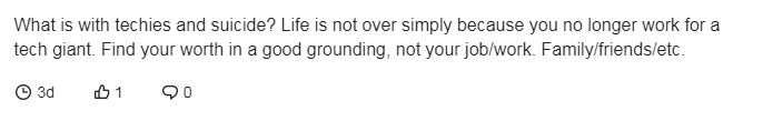 在如今的跳楼事件中也有网友说到:“生活不会因为你不再为科技巨头工作而结束。在一个良好的基础上找到你的价值,而不是你的工作。你还有你的家人/朋友等。”