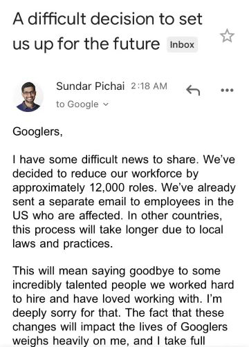 对于裁员的原因,谷歌CEO Sundar Pichai 表示,为了应对经济下行的状况,营收增长放缓,需要收缩边缘业务,将业务重心转移到人工智能。
