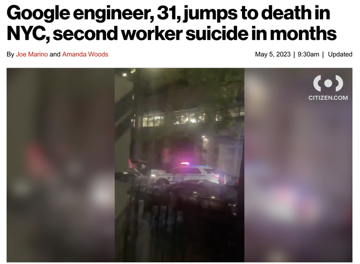 上周,一名谷歌员工,从位于纽约切尔西区的谷歌总部14楼一跃而下。