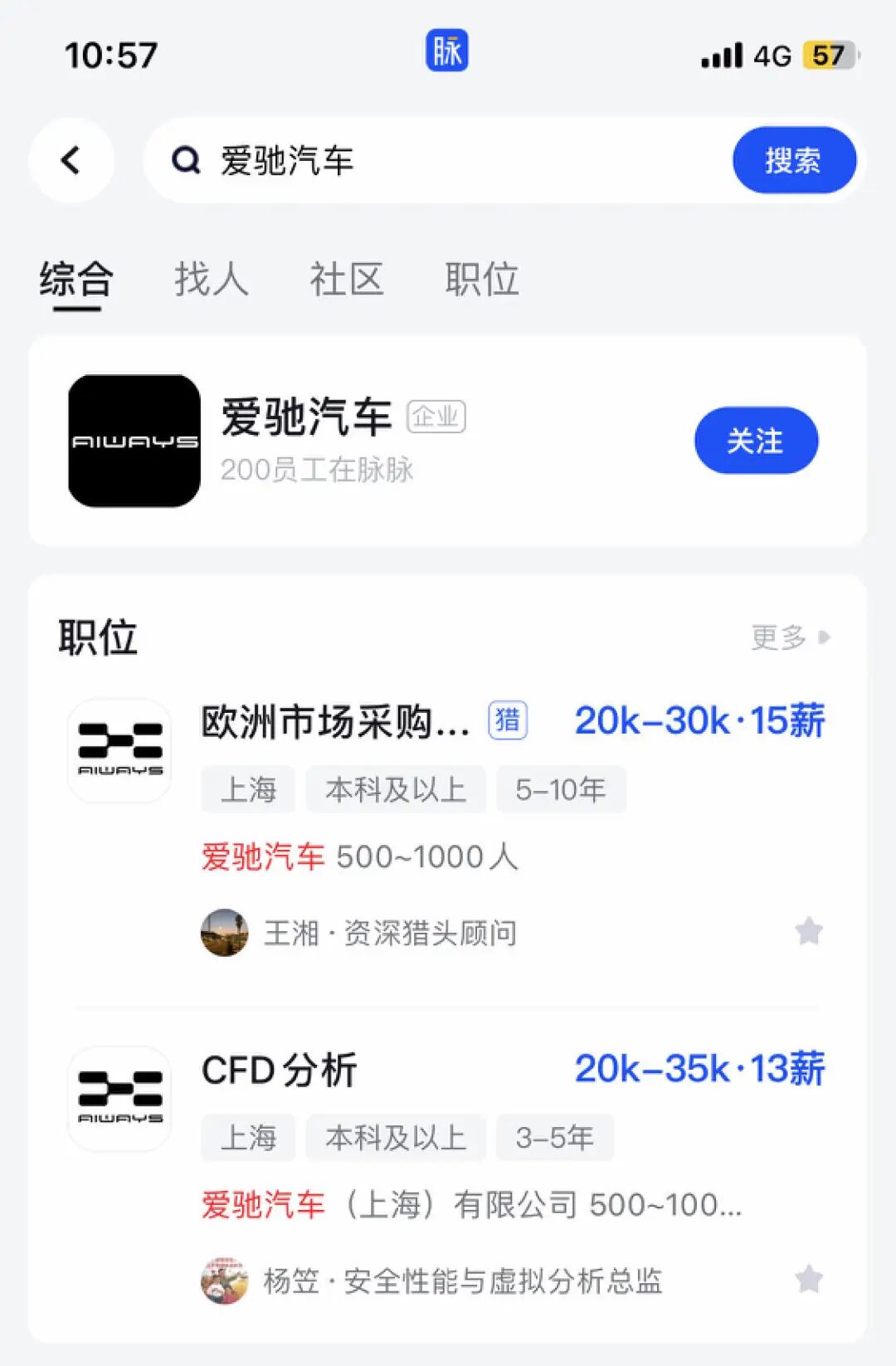 不过值得一提的是,虽然爱驰官方招聘平台已停止更新,但在脉脉搜索爱驰,仍能看到两条招聘信息,其中一个岗位为欧洲市场采购经理。