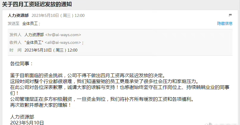 继4月被曝3月工资延迟发放后,爱驰汽车人力资源部再次通知全员延迟发放4月工资。