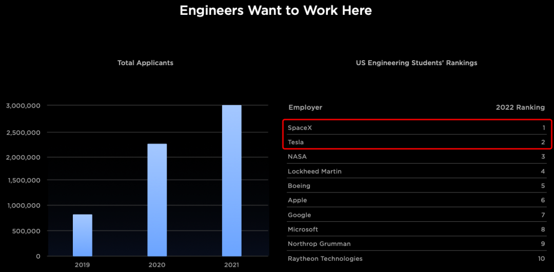 2022年特斯拉共计收到了全球360万份求职申请,马斯克直言“SpaceX和特斯拉是全球工程师最想去工作的两家公司。