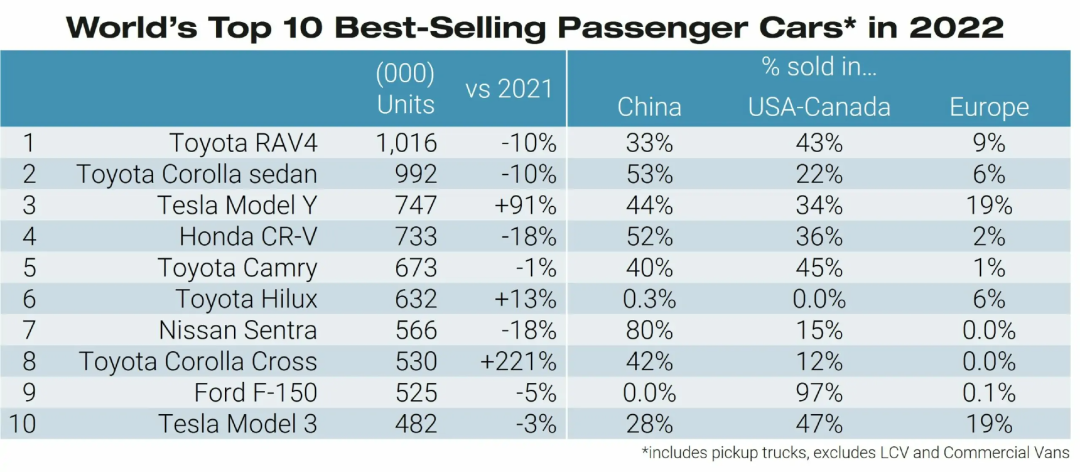 前不久,JATO Dynamics统计的2022年全球十大畅销车排行榜显示,特斯拉旗下的两款车型Model Y和Model 3入选,其中Model Y全球累计售出74.7万辆,仅次于丰田的RAV4和卡罗拉,位列第三。