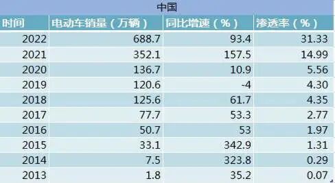 而国内更是遥遥领先走在电气化浪潮的前端,2022年,新能源汽车整体销量达到688.7万辆,同比增长93.4%,新能源渗透率达到31.33%。