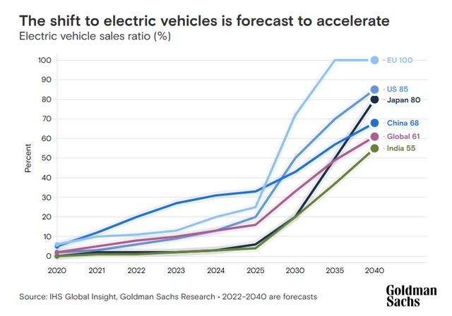 高盛研究公司预测报告显示,全球电动汽车销量将从2020年的200万辆飙升至2040年的7300万辆。预计2025年电动汽车在全球汽车销量中的占比,将达到16%,2030年达到33%;2035年电动汽车占全球新车销量的比例将突破50%的临界点,到2040年,这个数字将升至61%。