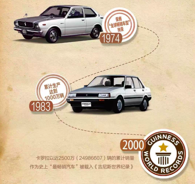 1966年,丰田推出的第一代卡罗拉,当时就在日本成为销量冠军,2000年,卡罗拉以2500万辆的累计销量作为史上“最畅销汽车”被载入《吉尼斯世界纪录》,这一年已经是卡罗拉诞生的第34年。