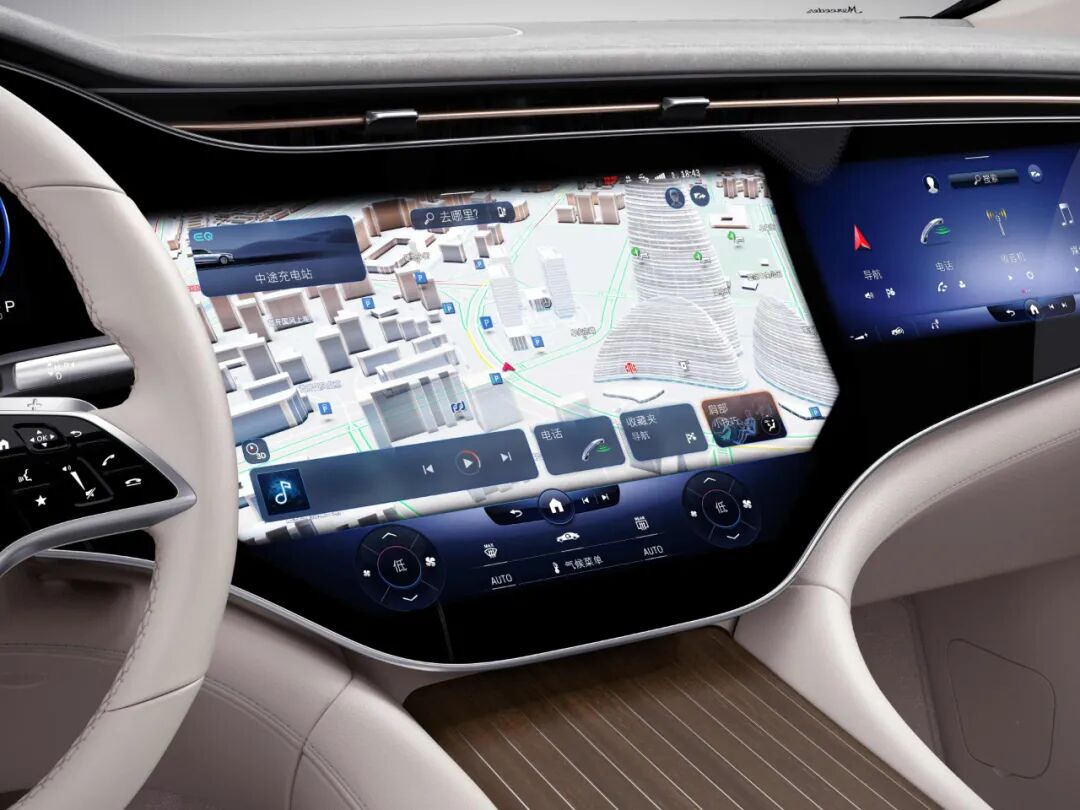 智能配置方面,奔驰也极其所能,把能有的全用上。比如EQS搭载了一块MBUX超联屏,由三块屏幕组成,长度达1.41米。