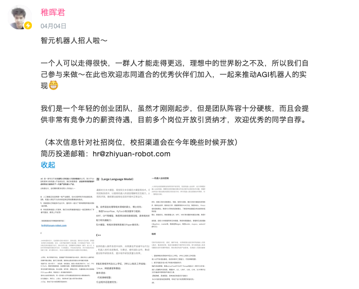 此后,稚晖君还在B站为公司招兵买马,涉及算法工程师、硬件工程师、软件开发工程师等多个岗位,希望可以共同推动AGI机器人的实现。