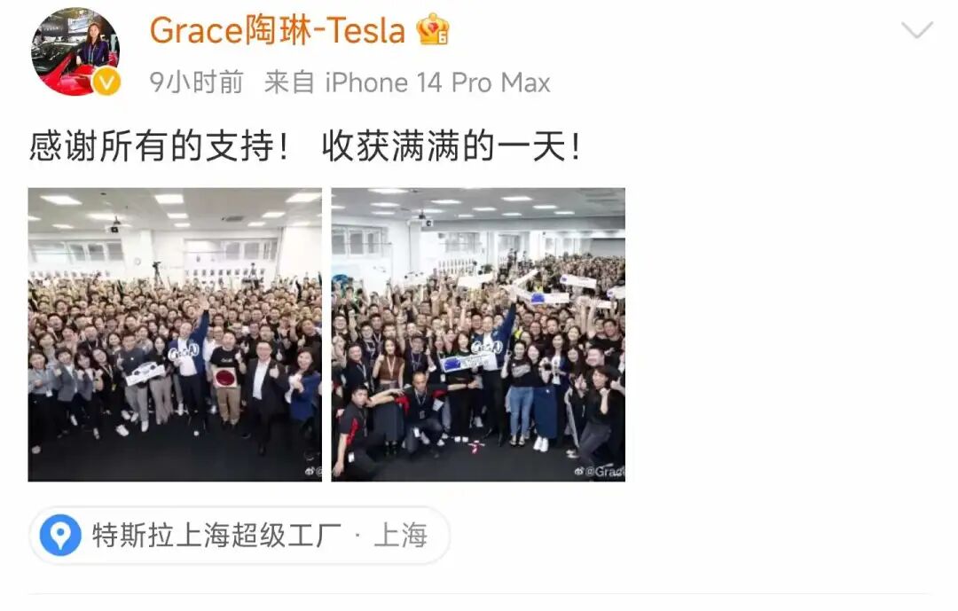 6月1日凌晨,特斯拉全球副总裁陶琳微博发布了两张马斯克与员工的大合照,配文“感谢所有的支持!收获满满的一天!”,地点定位是特斯拉上海超级工厂。