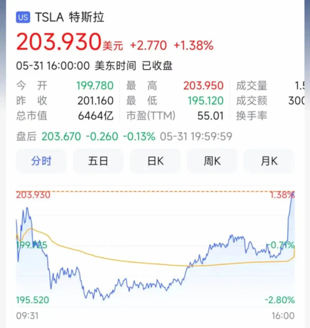 马斯克访华当天,特斯拉股价一路走高,一度涨近6%,最终收涨超4%,市值一夜大涨逾250亿美元(约1800亿人民币)。