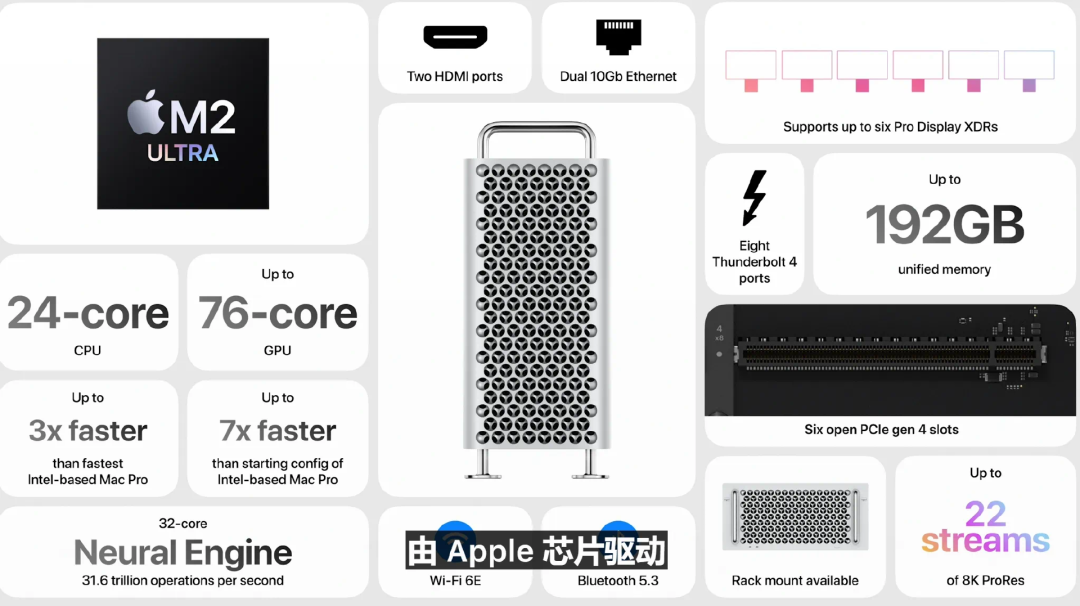 Mac Pro作为 Mac 系列中之前一直使用英特尔芯片的产品,这次也终于换上了苹果自研的也是迄今为止最强的 M2 Ultra 芯片。