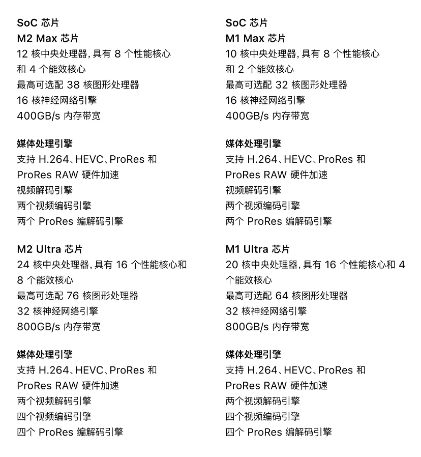 M2 Ultra芯片相比于上一代M1 Ultra的CPU性能提升20%,GPU性能提升30%,拥有 24 核中央处理器、最高 76 核图形处理器、最高 192GB 统一内存及 800GB/s 内存带宽,可流畅支持ProRes视频的编解码速度是M1 Ultra速度的3倍。