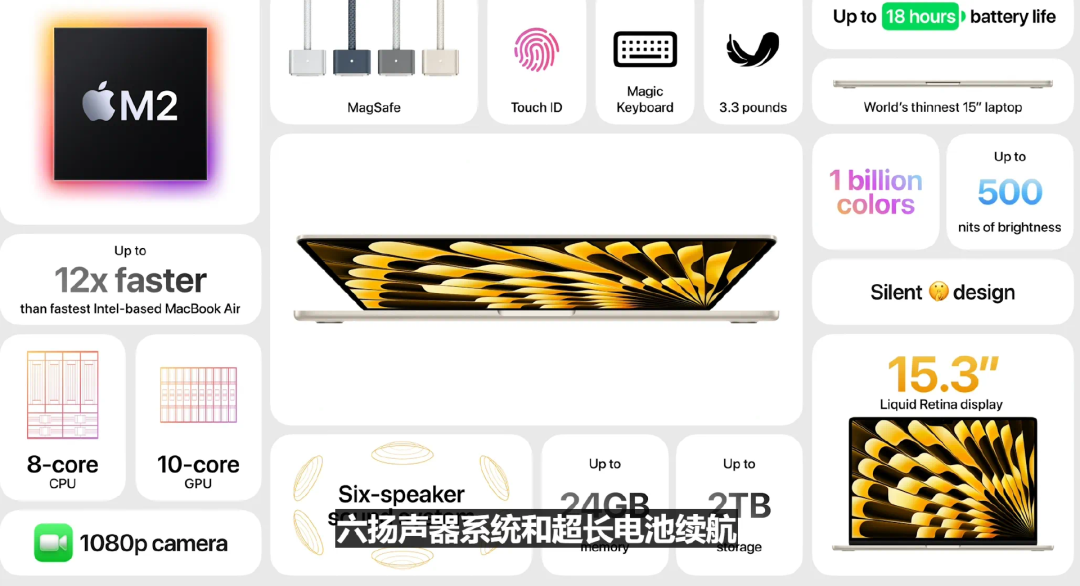 仍然搭载 M2 芯片,拥有 8 核中央处理器、10 核图形处理器和 16 核神经网络引擎,内存带宽为 100GB/s,仍然采用无风扇设计。其电池容量相应增加以保证续航能力与13英寸机型相同,为18小时,基本可以看作是更大一号的MacBook Air。