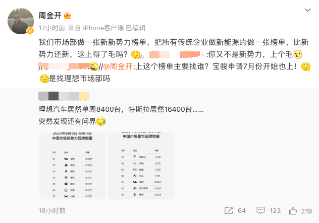其实也不能怪网友吐槽,本来车企一月一发的销量,理想硬生生地卷到了一周一发,关键是在最近的单周数据里,理想在各个细分领域都是一骑绝尘,有网友认为这么做并不地道。