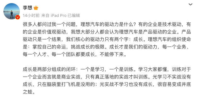 昨晚,李想发布了一篇长文,主题是理想的核心驱动力。