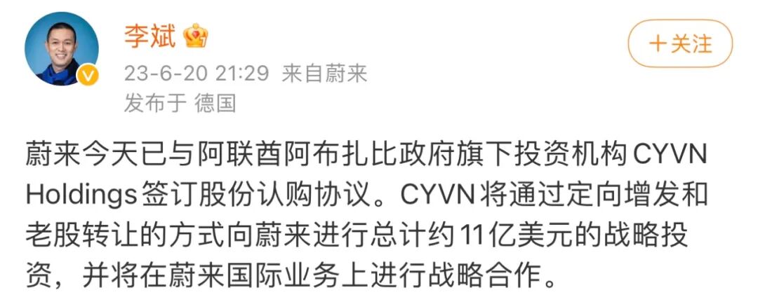昨晚,蔚来发布了这一公告,宣布和阿联酋阿布扎比政府旗下投资机构CYVN Holdings L.L.C. 签订股份认购协议。