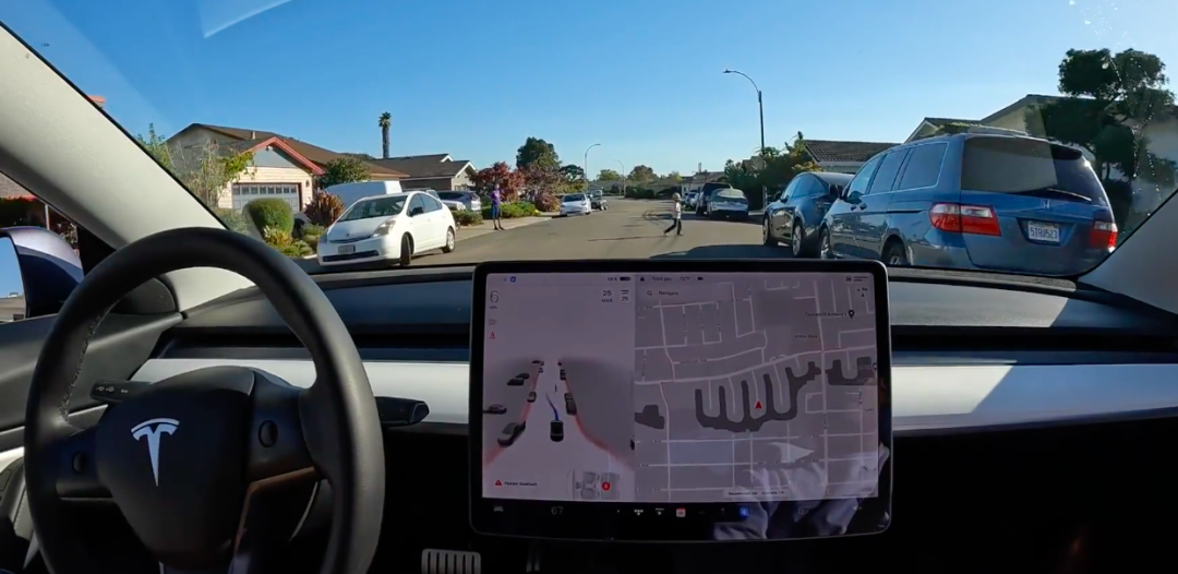 接着这名测试者从马路左边以正常步行速度走向对面,开启FSD的特斯拉再次准确识别。
