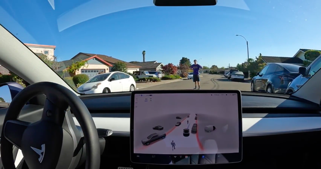随后奥马尔·卡奇让一名体型较大的成年男士站在路中间静止不动,再次开启FSD完全自动驾驶,这次也同样成功完成识别,绕过男士后,车辆再次回到道路中间继续行驶。