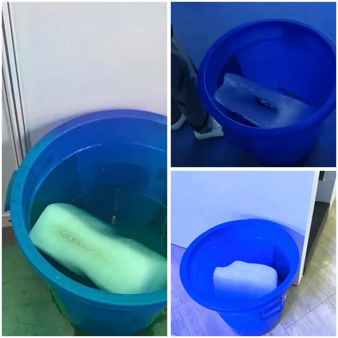 为了降温,成都车展主办方甚至在展馆中间放了不少大冰块,装着冰块的蓝色水桶成了这次车展的独特风景线。