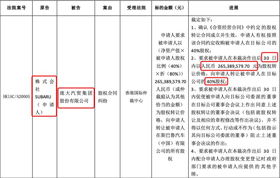 根据庞大集团发布的《关于新增诉讼及诉讼结果的公告》,申请人株式会社SUBARU(斯巴鲁)要求被申请人庞大集团以2.65亿元的股权转让价格,向斯巴鲁转让庞大集团在斯巴鲁中国的所有股权。