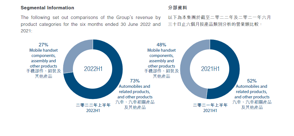 其中汽车、汽车相关产品及其他产品业务的收入约1092.67亿元,同比增长130.31%;手机部件、组装及其他产品业务的收入约410.7亿元,同比下跌4.78%;占集团总收入的比例分别为72.55%和27.27%。