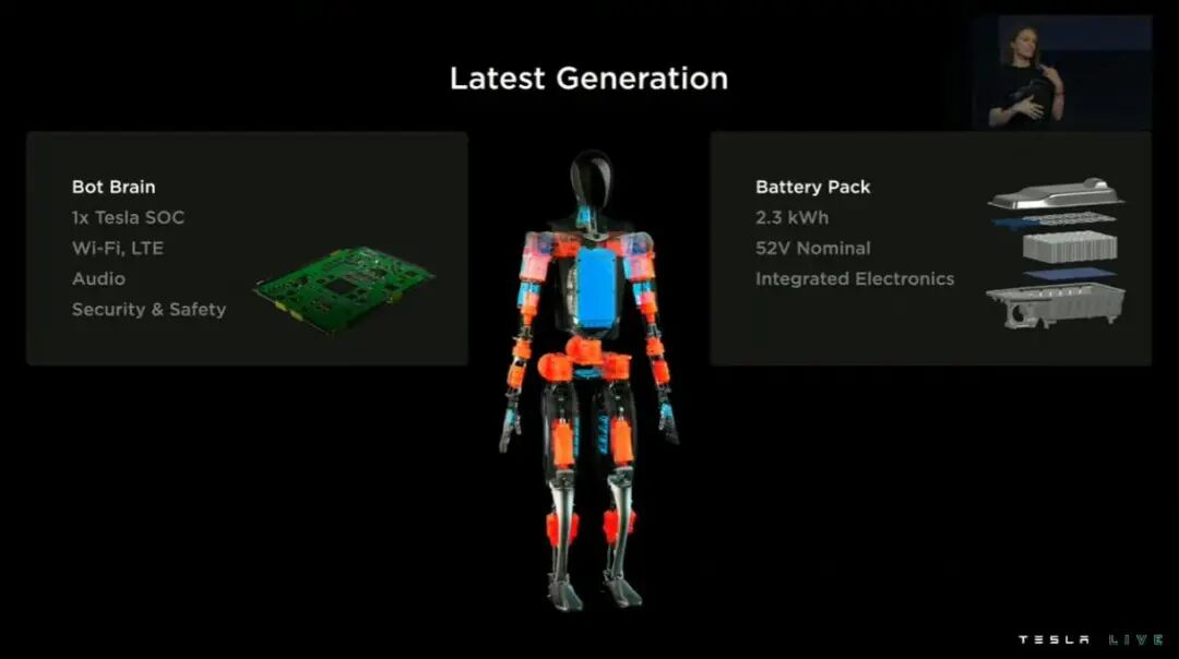 机器人包含一个2.3千瓦时的电池组,在特斯拉的SoC运行,并有Wi-Fi和LTE连接。