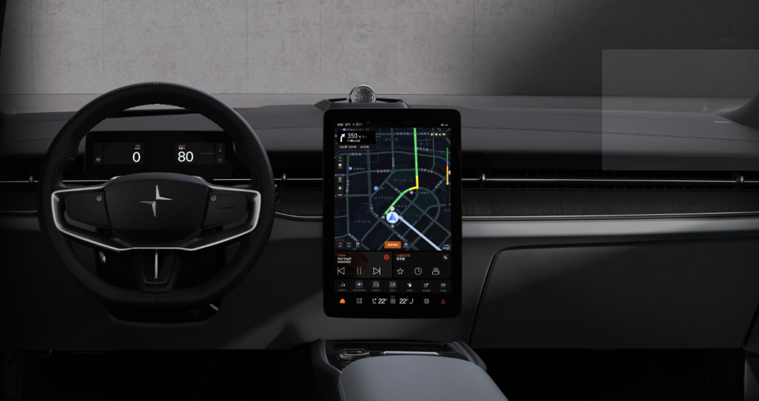 车内采用了9英寸数字仪表盘+14.5英寸的竖向中控大屏和HUD抬头显示的组合方式,中控屏内置了最新版本的Polestar Android Automotive操作系统。