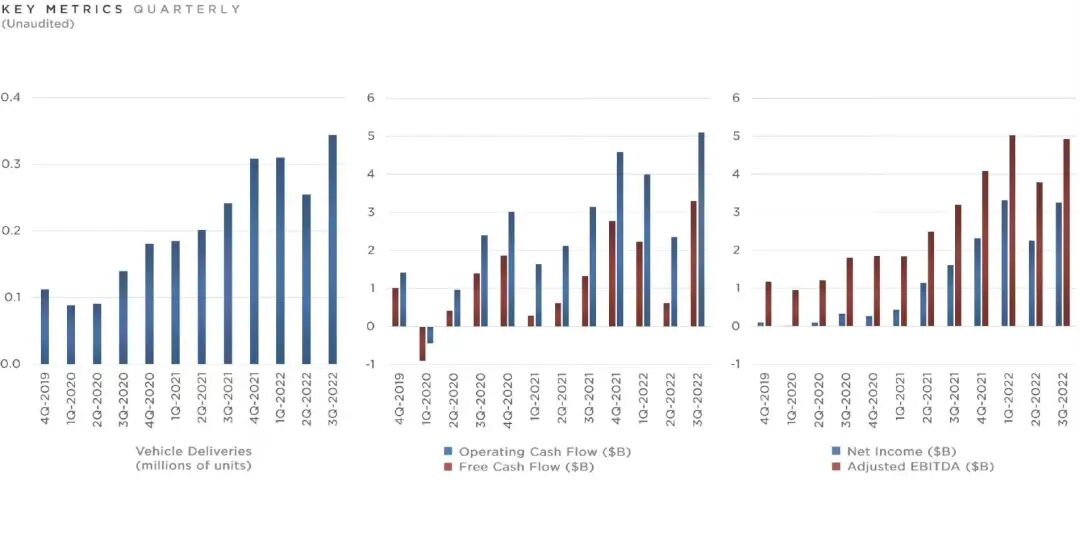总体来说,特斯拉的第三季度在收入、营业利润和自由现金流方面都创下了强劲记录,特别是汽车产能和交付量均创下单季新高,期内交付汽车34.3万辆。