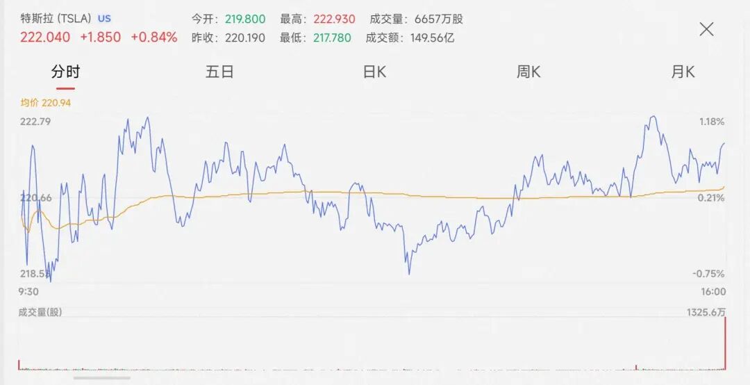目前特斯拉股价为222.04美元,总市值6958亿美元。