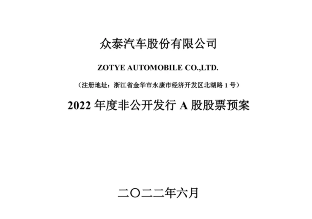 今年6月份,众泰汽车曾发布过非公开发行股票方案。打算向不超过35名特定投资者发行不超过15.2亿股,募集资金不超过60亿元。