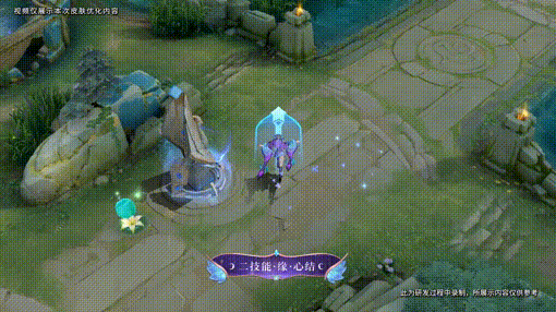 二技能在消失的位置出现一只蝴蝶虚影,丢出去的花球看不太清,英雄头上的印记叫做“鸢尾花”,也是开场动画中花海的种类,在位移的过程中,身前有一个类似能量罩的元素,也很符合貂蝉2技能短暂无敌的效果。