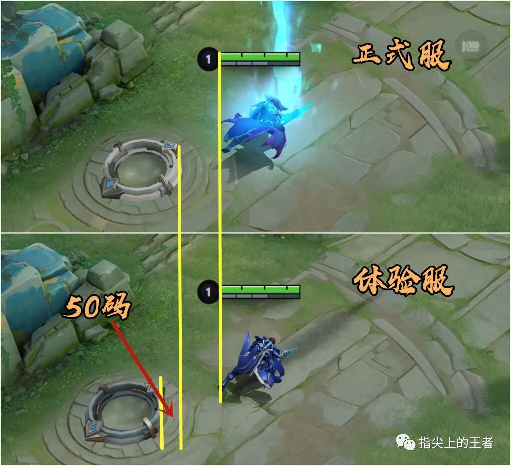 肯定也有人不知道这个50码的距离到底有多远,其实就是半个身位的距离,我在体验服测试了下,在进入训练营的初始位置使用三次1技能,对比正式服,上图中正式服和体验服防御塔的距离就是加强的50码,或许看起来并没有太大的变化,但是就因为这一点点的改动,让曹操有了更多的可能性。