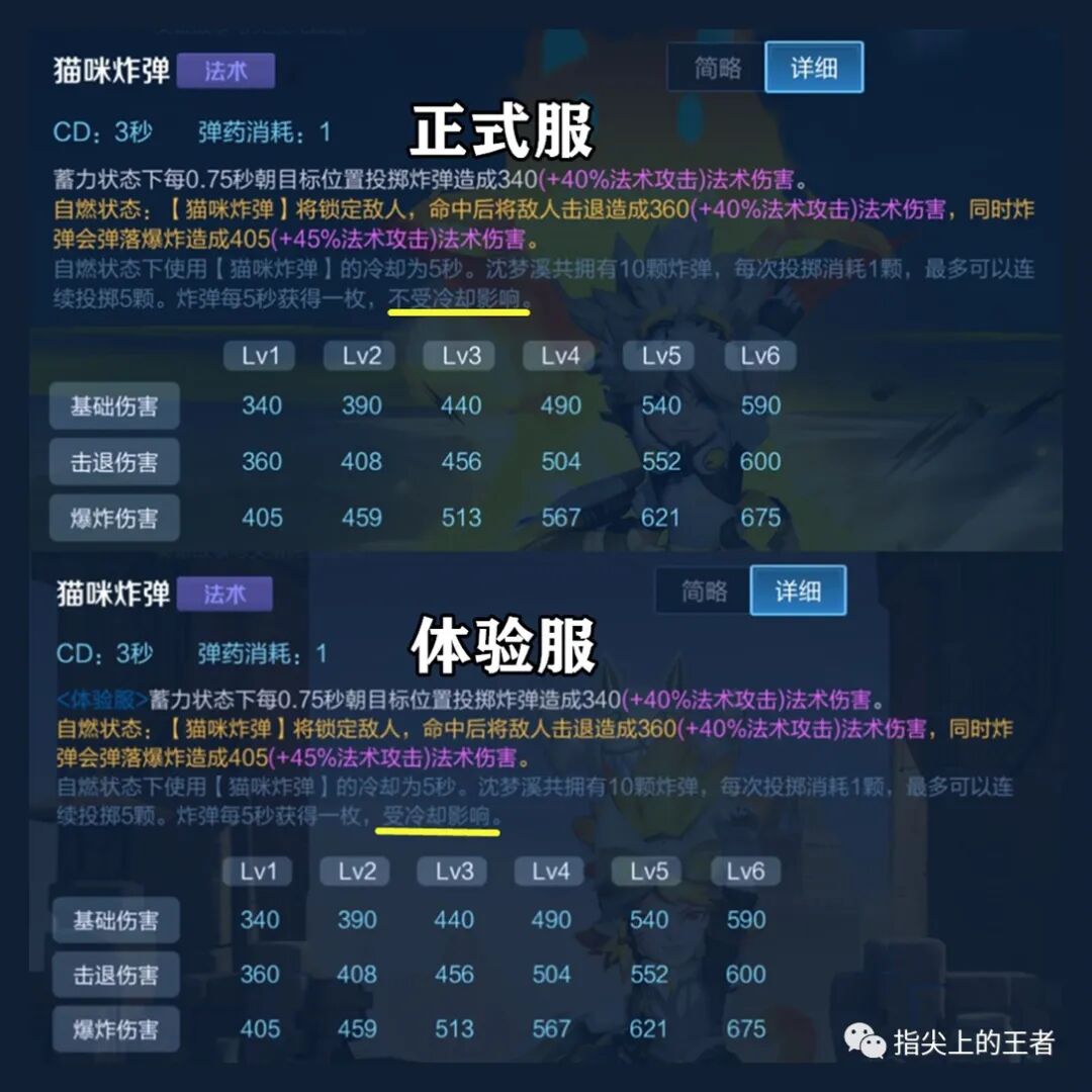 沈梦溪的文案是修复了沈梦溪被动技能的错误描述,其实是1技能被动技能的描述,通过对比可以看到,1技能的炸弹获取从“不受冷却影响”变成了“受冷却影响”,其实玩沈梦溪的玩家都知道,他带冷却装备有部分效果是浪费的,只能增加大招的冷却速度,1技能这不受到影响。