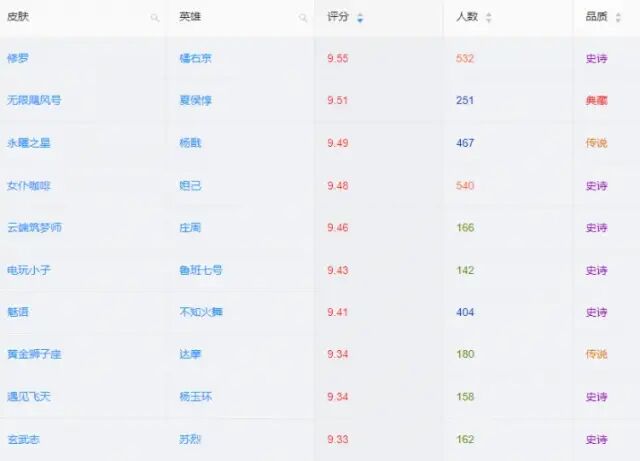可以看到,根据论坛玩家的投票选择,皮肤的质量用分数来表达会更加清晰,但是这个评分的排名的确是我没想到的。