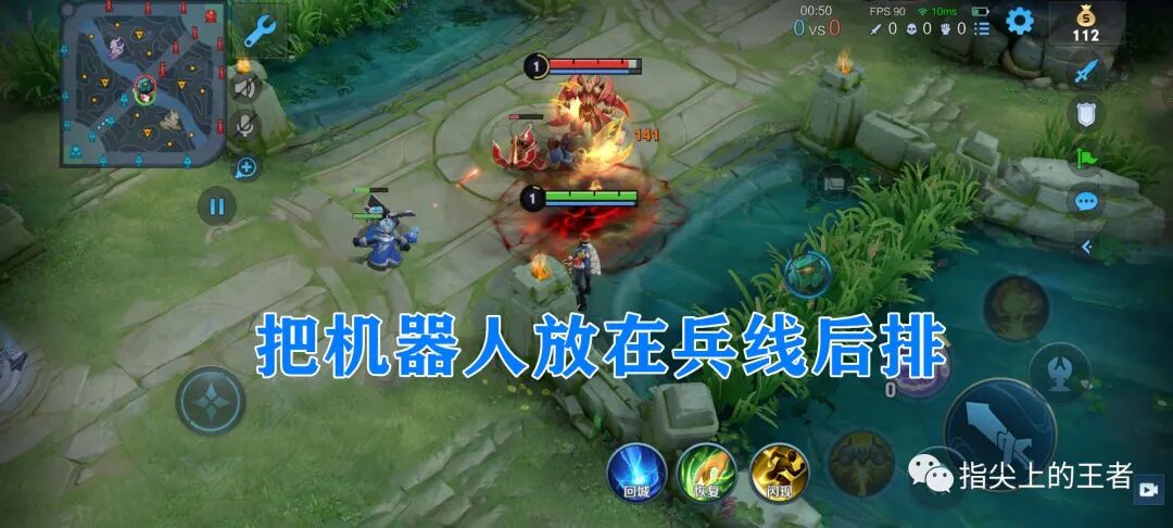 这里有个点,如果你面对的是不知火舞、张良、墨子、杨玉环这样的法师,可以在高地前 把鞋子卖掉换成咒术典籍,加强机器人的耐揍性,之后直接进入草丛,把机器人丢在兵线后排,这样能够在快速清兵的同时,干扰敌方的清兵效率,如果你遇到的是清兵速度很快的英雄,直接鞋子起手,常规清兵就行了。