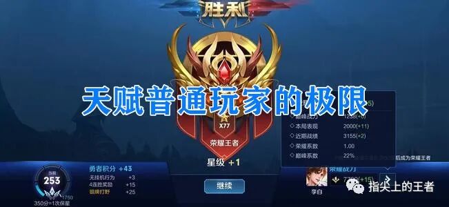 达到了荣耀王者,对于顶端局的比赛能看得懂,有节奏,有支援,有意识,英雄的操作都能做到完美,知道了什么时间点该去做什么,但是相较于顶端局的玩家来说,是意识上的差距。