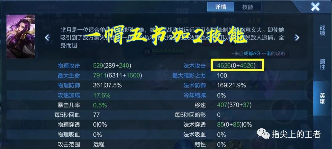 芈月的属性其实和程咬金很像,没什么控制,就是保命能力比较强,因此同样是走边路的牵制流玩法,但是很多人都不知道,芈月的法术伤害在王者峡谷中是独一档的存在,上图我用帽子加五个大书,2技能吸满的情况下超过了4600的法强。