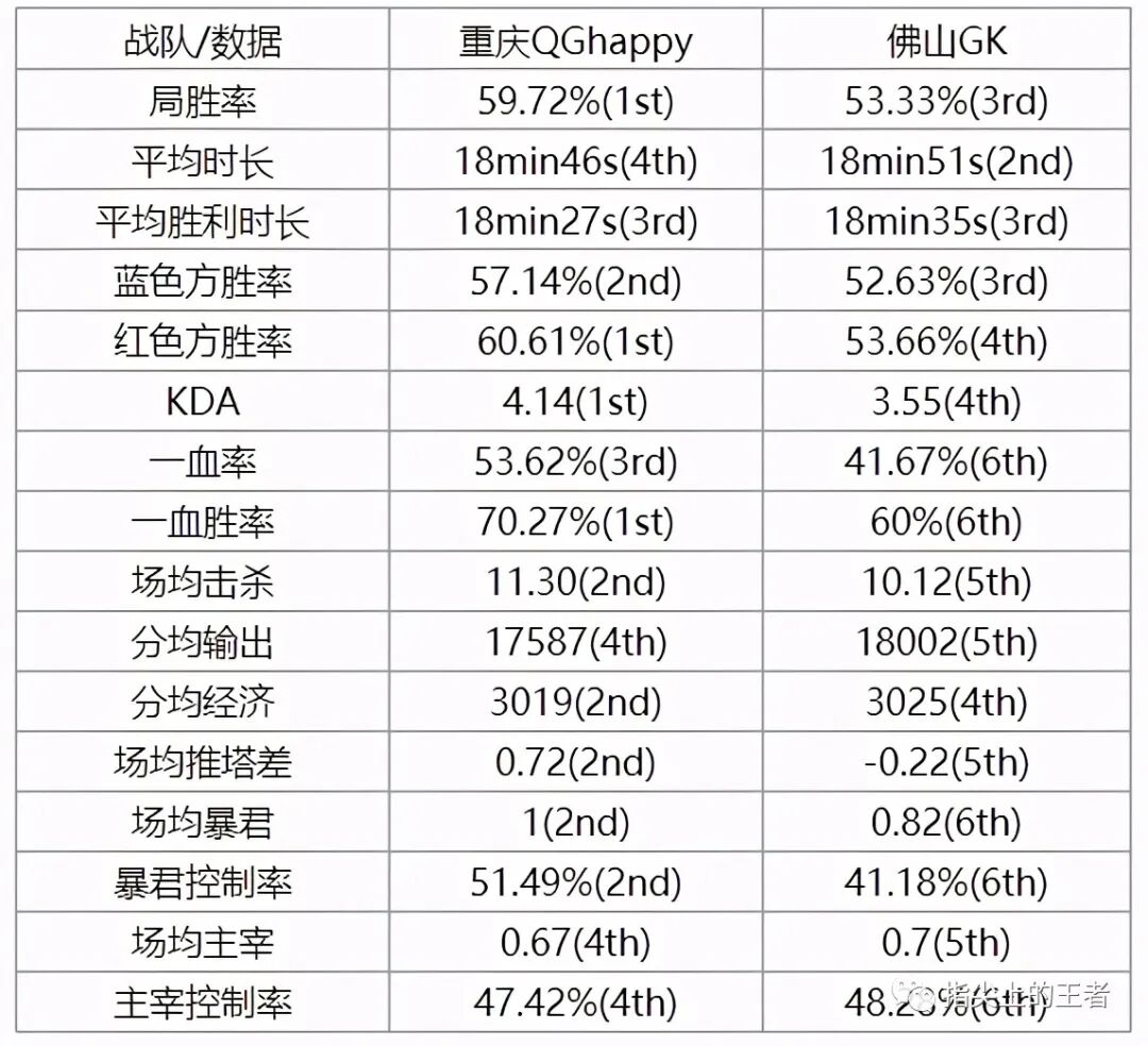 因为赛场上和我们路人局大不相同,他们以优势拿暴君为主,拿主宰属于退而求其次的选择,所以从这两个数据上可以看到,GK的前期是需要加强的地方,相对而言,QG在前期的强度显然更高。