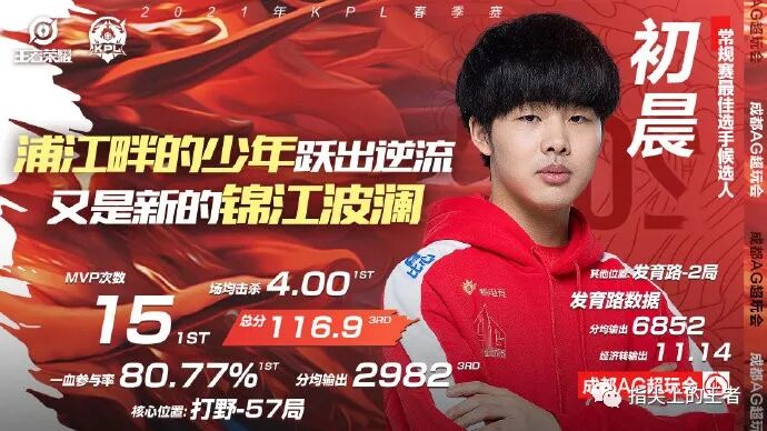 来到AG的他终于不用再被队友束缚,每个队员们的状态都很强,于是在队友扛起其他位置大旗之后,初晨终于没有了负担,直接成了队伍中的绝对核心,每一场比赛都有他高光的身影,更是拿到了15次mvp,全联盟第一,初晨甚至是很多玩家心中的常规赛mvp。