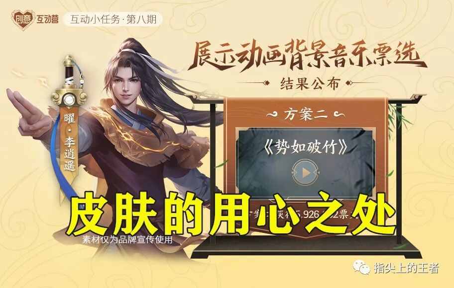 李逍遥皮肤上线前投票了语音包,这也是第一个可以更换背景音乐的皮肤,作为传说限定皮肤,李逍遥算得上争议相对较少的皮肤了,相较于音你心动的两个皮肤,这个皮肤的吐槽声音明显更小,这不单单体现在他是个联动皮肤,还有皮肤本身的精良制作。