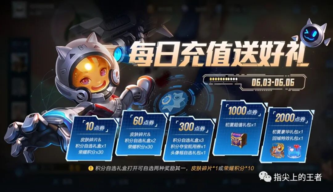 新皮肤上架,永远不会缺少的就是充值的活动,对于想要买皮肤的玩家这是必不可少的,而对于不买皮肤的羊毛党也是期待已久,1元6元来攒积分,最后用积分抽奖,欧皇玩家直接一发入魂水晶,那就赚大了。