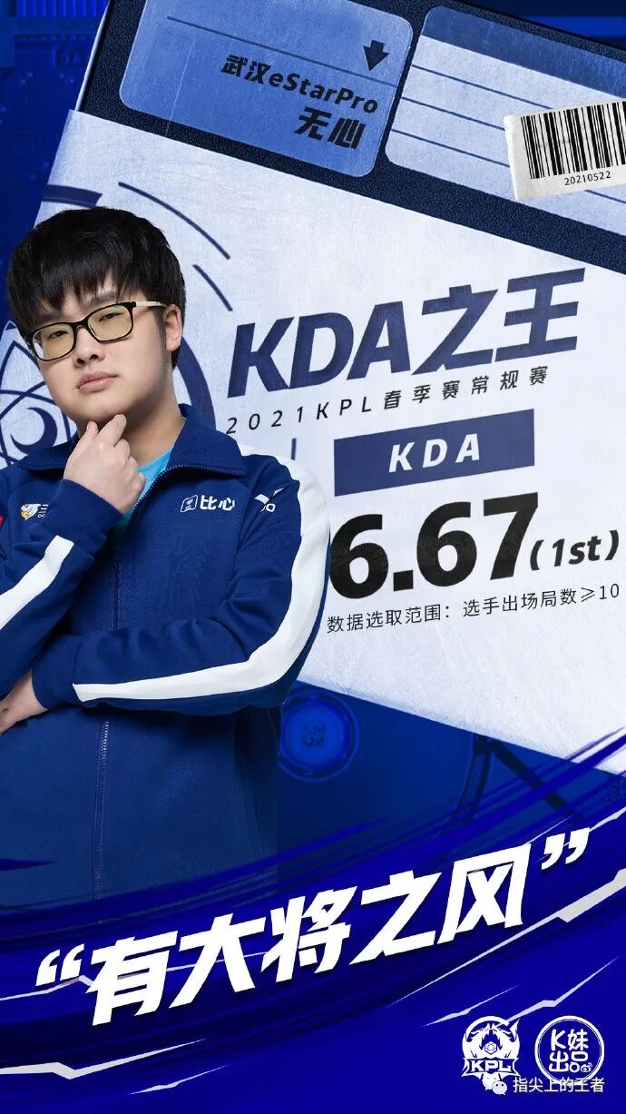 无心,一个完全被低估的选手,以前在estar有猫神的压制,无心在各个位置乱窜,但他自己知道,最强的地方还是中路啊,无心在赛场上的表现我只能想到一个人,那就是老帅,或许没有太多的高光操作,但是稳住自己的位置就是给队伍最好的保障,作为法师,能够保持kda其实是个很难的活,无心排名第一的KDA的确是最适合他的荣誉。