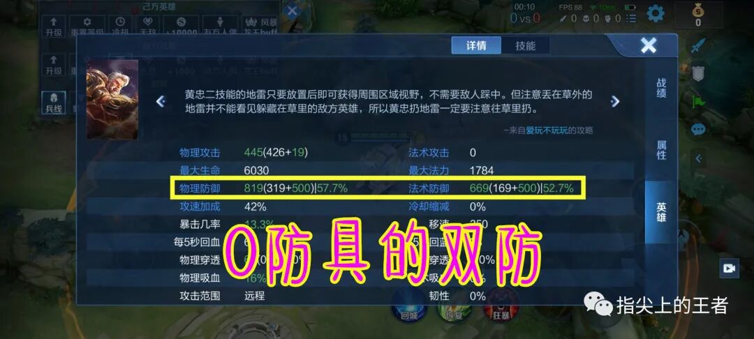 在一次调整的时候将大招的双防再次提升一个档次,满级500点双防,可以让他落地后拥有800多的物理防御以及600多的法术防御,相当于两件防具加身,此时黄忠的坦度是很可怕的,刺客英雄想要单切开大的黄忠,难度简直太高了,别忘了黄忠2技能还可以给自己增加一个护盾。