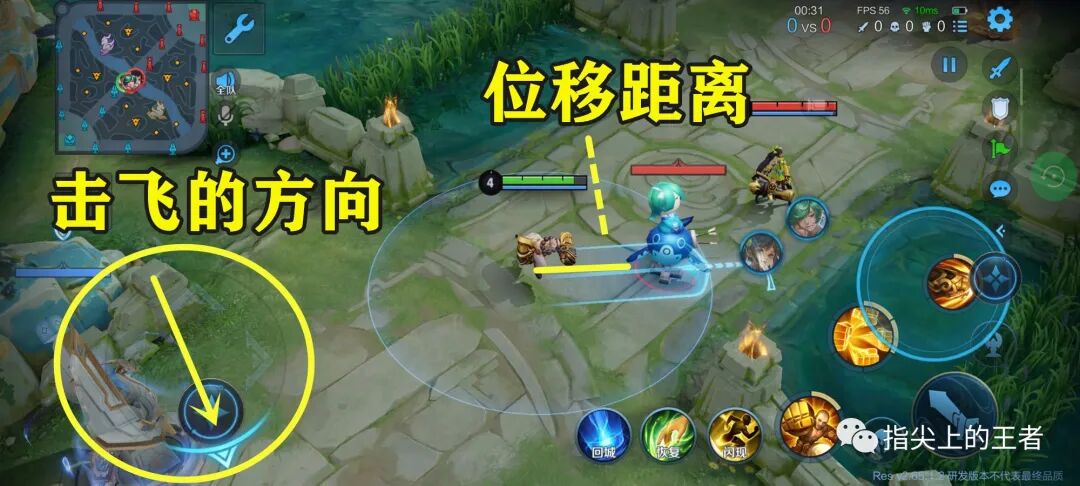 在使用大招的时候,脚下会出现一个和李元芳被动一样的小箭头,这个就是敌人会被击退的方向,而控制这个方向的从大招技能本身,变成了左手的轮盘,就像不知火舞使用技能后的翻滚一样,第一段大招决定了你短暂位移的方向,而左手才是控制击退距离的关键。
