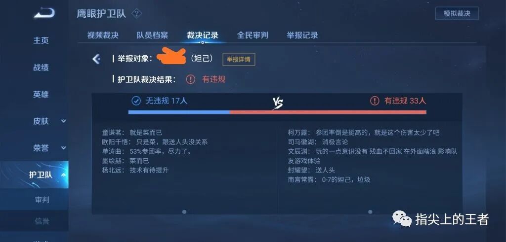 记得我以前入鹰队的时候,会签署保密协议,也会经过培训,以及评判的准则,说白了就是受到了约束,加上有游戏内段位限制,所以裁决出来的单子大多都能客观公正,目前鹰队的入队条件非常开放,可以说只要你不经常违规就有资格加入,所以说你是钻石也好王者也好,哪怕是黄金,只要你达到了入队等级,就能加入。