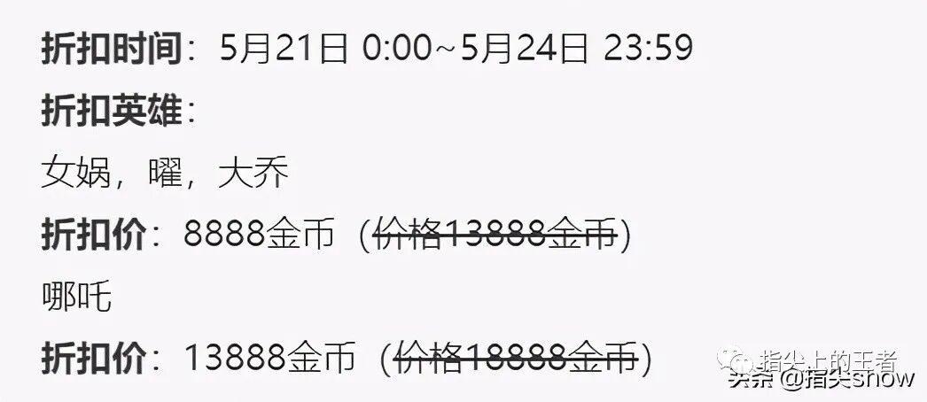 女娲、曜、大乔、哪吒三个英雄直降5000,这样的活动对新手来说是最好的,其中哪吒是18888档的 英雄,但是并不是很建议换,我觉得最值得练习的两个英雄,一个是女娲,一个是曜,前者练好在高分段非常厉害,而曜吗,最近有消息说要联动仙剑,出李逍遥的皮肤,真假未知,但是早晚要买,我觉得没有曜的可以入手。